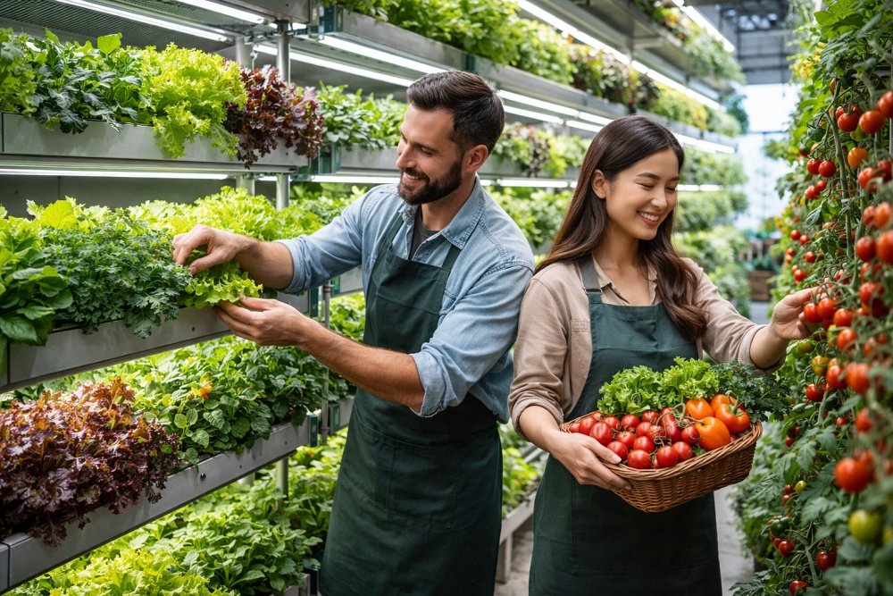 Manfaat: Penggunaan air minimal, rantai pasokan hiperlokal, pengurangan signifikan dalam mil makanan