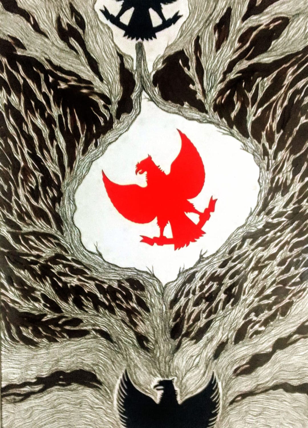 Di sini, Bambang Asrini menghadirkan serial Garuda, simbol negara yang sejak kelahirannya dimaknai sebagai penuntun arah moral bangsa. Siluet Garuda dalam karyanya bukan representasi literal, melainkan hasil kontemplasi panjang atas makna Pancasila sebagai pandangan hidup. Garuda dilihat bukan sebagai ikon kekuasaan, tetapi sebagai jangkar nilai kebangsaan yang menuntut kejujuran, keadilan sosial, dan kemanusiaan.