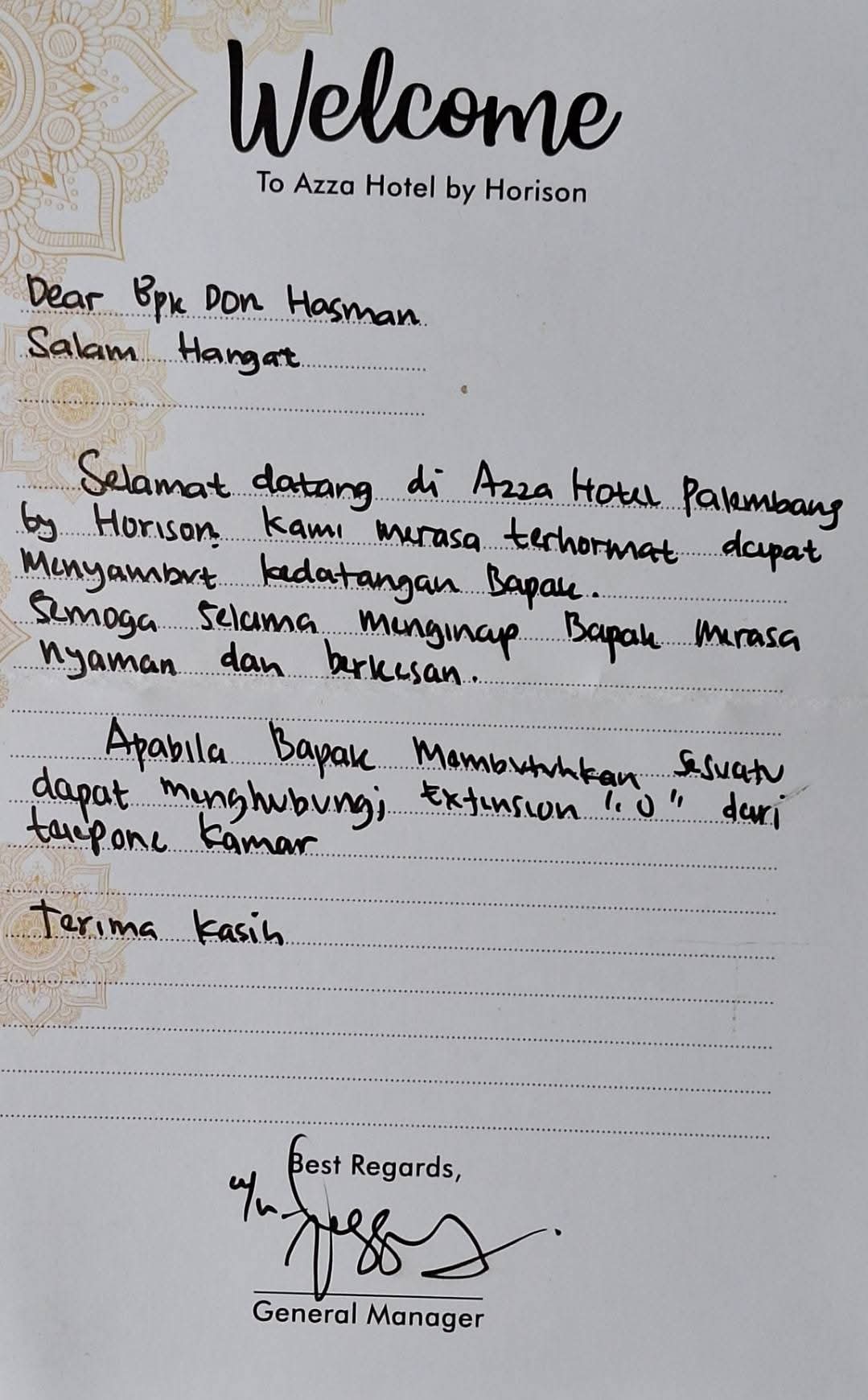 "Sungguh, saya merasa dihormati disambut ketika memasuki sebuah hotel di kota Palembang, Sumatera Selatan. Penyambutan berupa tayangan video di lobby dan secarik kartu di kamar hotel tempat kami menginap selama 4 malam pada akhir Oktober s/d awal bulan November 2025," tulis Don Hasman.