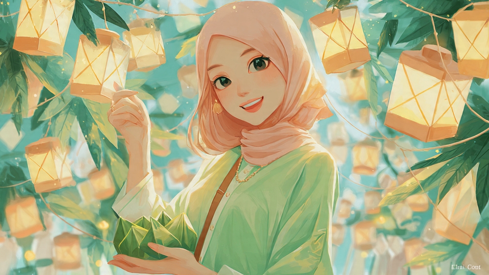 Contoh prompt: “Buat foto portrait bergaya anime yang terinspirasi dari perayaan Idulfitri, dengan pencahayaan lentera yang hangat, aksen ketupat, palet warna pastel lembut, dan ekspresi ceria.”